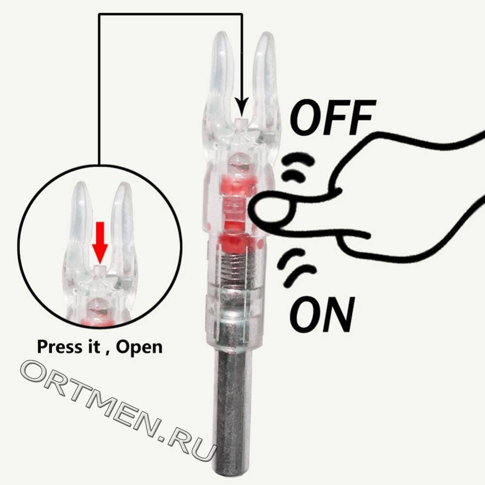 Хвостовик с подсветкой для лучных карбоновых стрел. 6,2 мм диаметр хвостовика. Срабатывает в момент выстрела, выключается кнопкой.