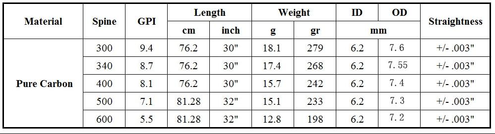 | Spine | Вес гран на дюйм | Вес трубки |