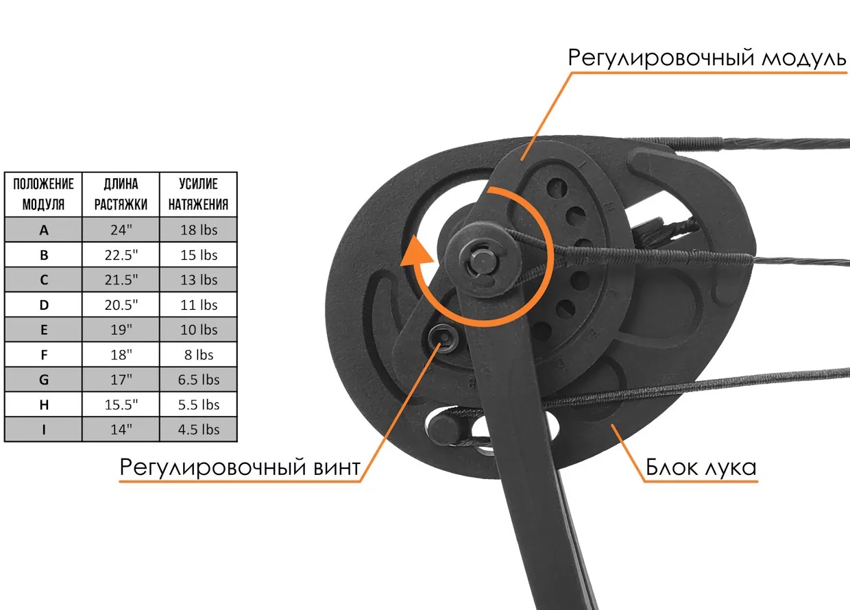 Лук комплектуется всем необходимым для начала стрельбы: крага (для защиты предплечья от соприкосновения с тетивой в момент выстрела), полочка и прицел. Как дополнительная опция – к луку прилагается так называемый «кивер». Он выполняет функцию колчана, который крепится к рукоятке лука и позволяет носить стрелы прямо на луке!