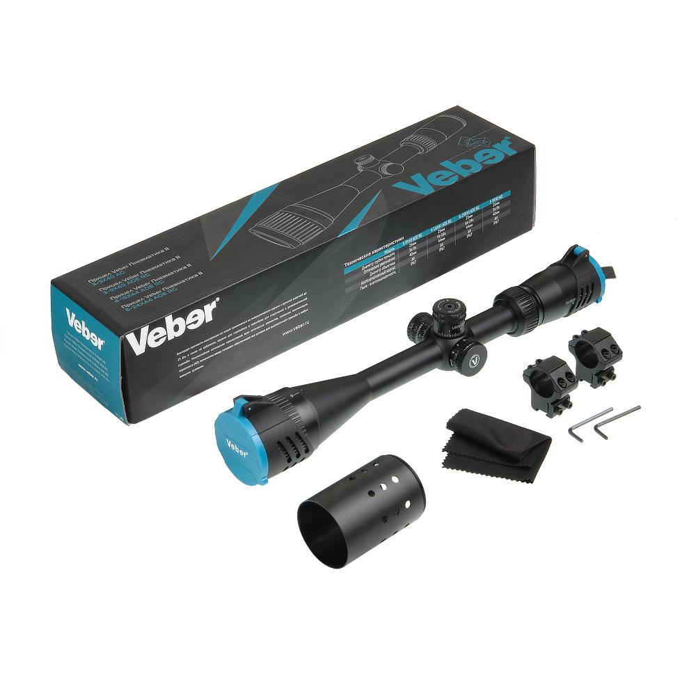 Veber Пневматика II 6-24х44 AOE RG – светосильный прицел нового поколения для мощных пневматических винтовок с энергией выстрела до 25 Дж. Может устанавливаться на арбалеты, оружие для страйкбола и пейнтбола. Изменяемая кратность прицела позволяет успешно вести стрельбу как на ближних, так и на дальних дистанциях, использовать его, например, и для плинкинга, и для бенчреста.