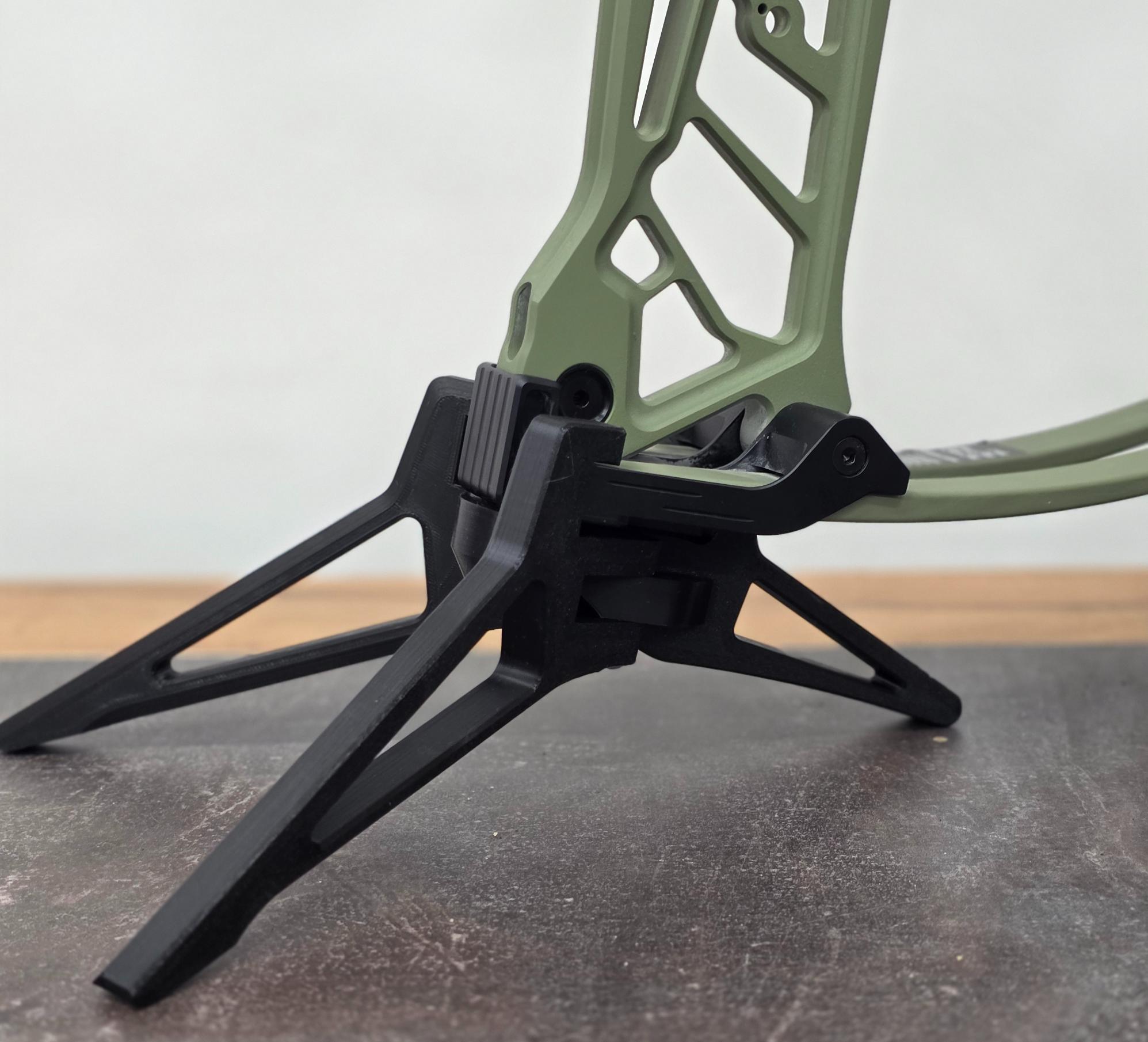 Подставка устанавливается на карманы лука, тем самым в стоящем положении не цепляет блок, главное удобство подставки это стрельба не снимая ее с лука.
