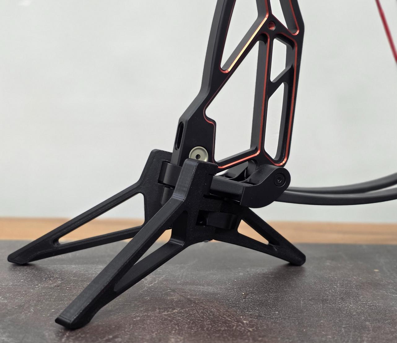 Подставка устанавливается на карманы лука, тем самым в стоящем положении не цепляет блок, главное удобство подставки это стрельба не снимая ее с лука.