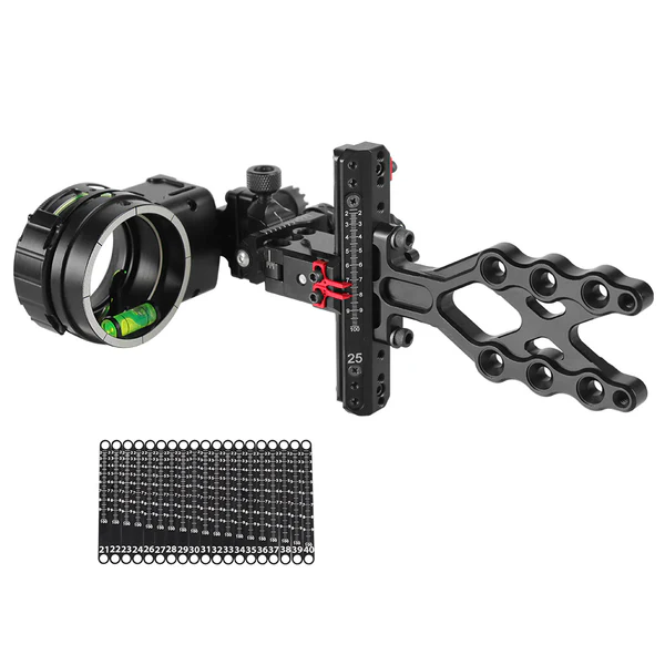 В комплекте набор планок с рисками для пристрелки прицела в зависимости от скорости лука.